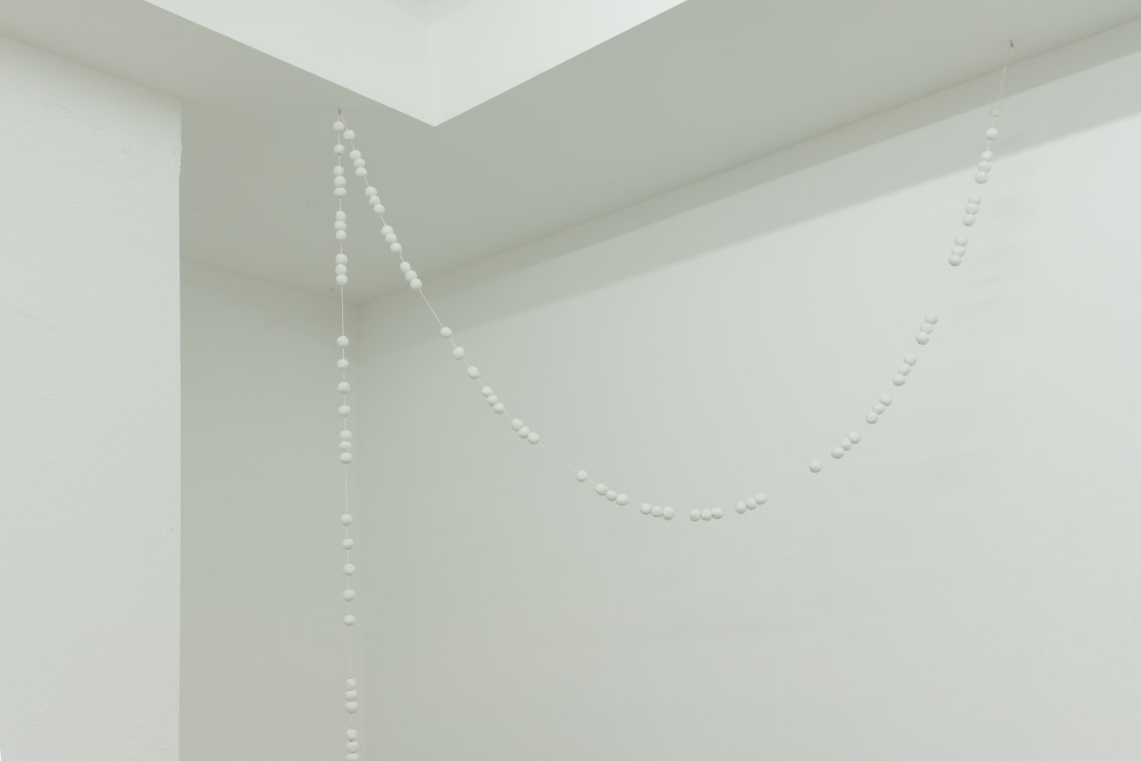 Anna Júlía Fridbjörnsdóttir’s (1973) work Speed of Light (2021) consists of irregular-shaped and hand-made beads of bone ash and stone clay threaded onto a string forming a Morse code where a single bead stands for a dot and three continuous beads a dash. They spell out the digits of the exact numerical for the speed of light, 299 792 458m/s (written: 299792458 ms-1). That light has a definite speed which is the same for every observer was first proposed by Albert Einstein in 1905 as part of his Theory of Special Relativity. It means nothing less than that there is not space AND time, only spacetime; it means that time can dilate, and space contract; it means that there is an equivalency between mass and energy, as expressed in the formula E = mc2, with the constant c being the speed of light.