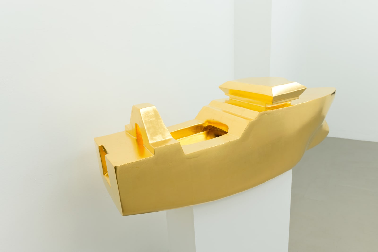 The Golden Ship (2016) by Hulda Rós Gudnadóttir (1973) is a model of a fish troller covered in 23.75 karat Rosenoble gold leaves. Many seaside communities’ economies rely on fishing, having long abandoned the picturesque fisher boats of old. The harvest of fish in the sea has become thoroughly industrialized, an industry with a global yearly production of 180 million tons, valued at almost 400 billion US-$, the fishing trawler being its symbol. In the same vein, The Golden Ship alludes to the global rise of capitalism by maritime exploration, exploitation and trade ever since the “discovery” of America and the sea-route to the East Indies. It is the vessel of the quest for new territories to discover, new worlds to conquer and new riches to seize, beyond the sea and in the skies above.