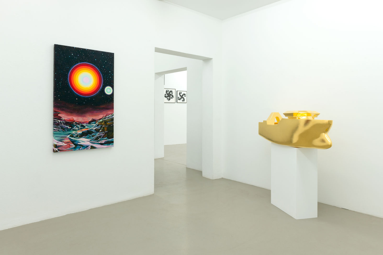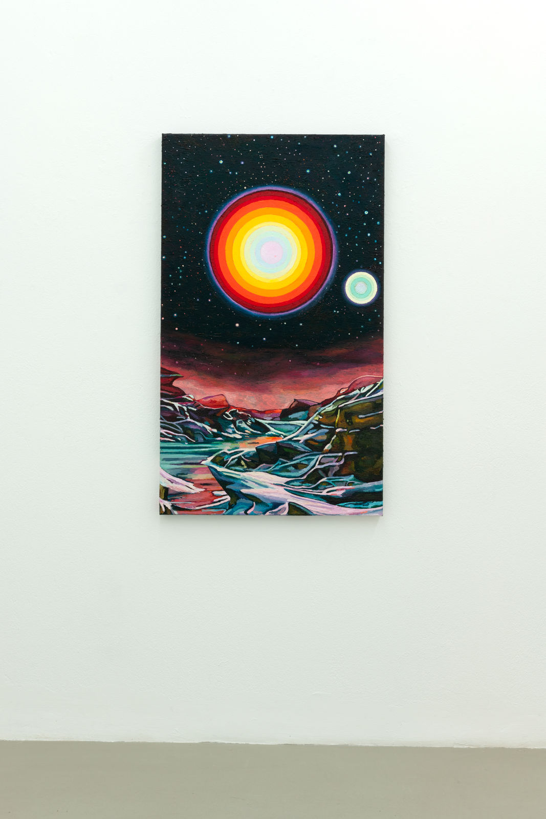 First Day (2016) and Binary Solarsystem Fourth Day (2017) by Erla Haraldsdóttir (1967) appear if the artist had shifted from contemplating a scene to painting the subject from within the point in the biblical text where light comes into being, where water is separated from water, where dry land emerges and the earth brings forth plants. What we see is a meeting between the Creator and the creative artist in which the story of creation unfolds. The Hebrew word used for the Creator’s achievement can mean both “create” and “play”. In play, we use our imagination to test, deepen and transform reality. As such, this reenactment of the subject of creation is clearly marked by the exploration and experimentation characteristic of play, transforming the “nostalgia for the primordial” (Eliade) into a presence.