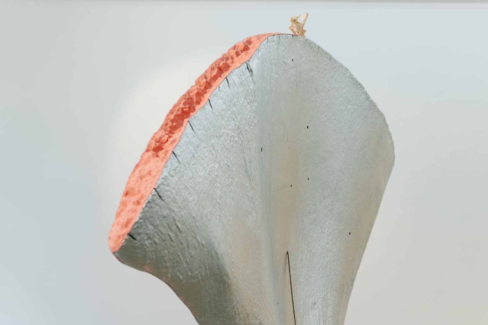Fridbjörnsdóttir’s work ultimately brings together diverse systems of representation, each with its own specific epistemological relation to the environment, to create hybrid sculptural objects that materialize specific ‘readings’ of ‘nature’ across history. For example, the works Pre-fall and Runway consist of a 3D milled whale bone made from a scan in the collection of the Natural History Museum in Copenhagen. The bones are from an Atlantic Right Whale, once common in the waters around Iceland and now on the verge of certain extinction. Fridbjörnsdóttir has engraved the concentric diagrams used to read latitude and time from an ancient Astrolabe, piercing the bone at a significant seasonal date, while covering one side of the bone with reflective aluminum, which provides a further surface for spatial positioning. The juxtaposition is especially poignant since the migratory routes of this species fatally intersect with major transatlantic shipping corridors.