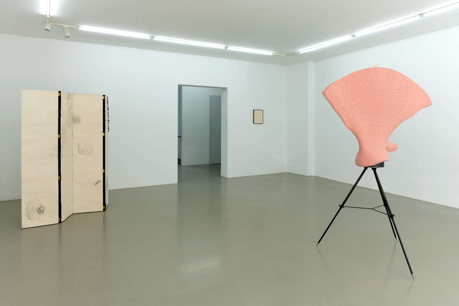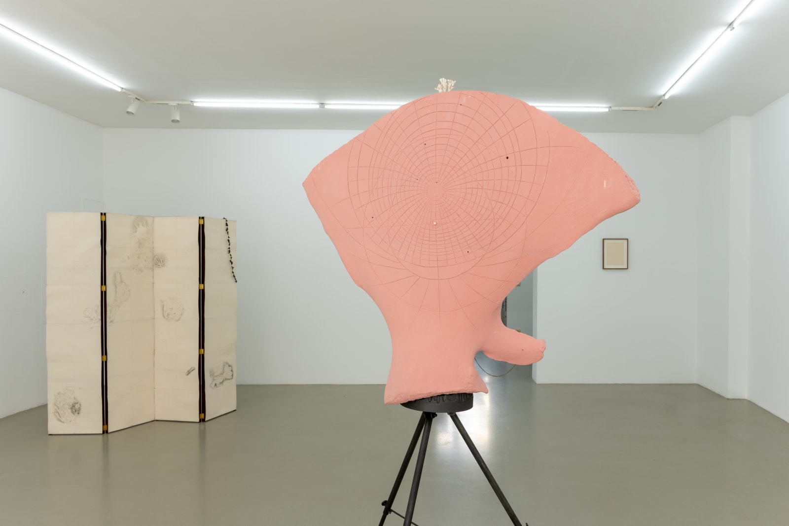 In the work Runway we are presented with the smallest rib of the Atlantic Right Whale that has become amalgamated with elements from horary quadrants that were used to calculate various readings, such as longitude, latitude, and time of day. In Edition Fridbjörnsdóttir further amplifies this strategy with aesthetic concentration by lacing the pattern of a cylindrical sundial or ‘Shepherd’s dial’ around a cast Walrus tusk of an extinct species formerly native to Iceland. Engravings and drawings are used by the artist across these works and others in the exhibition, expanding references to the history of cartographic technologies from pre-history up to digital scanning, and thus to the changing perception of, and relations to, our place in the natural world. If the elaborate geometric designs of the Astrolabe represent a slice of heaven in the hand, other works invoke cosmic relations in minimally aesthetic ways: A group of works - Autumn, Winter, Spring and Summer uses gold leaf on simple graph paper to represent seasonal percentages of sunlight. The grid, another ordering system all too commonly overlaid on the landscape, is foil to several other wall-hung works. Finally, Silhouette uses an unfolded screen structure adorned with sketches of sea bed species and navigational digits indicating depth overlaid with a star map with cutouts in the paper. Hanging on the structure, as if casually placed whilst undressing, a ‘necklace’ made of replicas of deep sea corals overlaps the drawings.