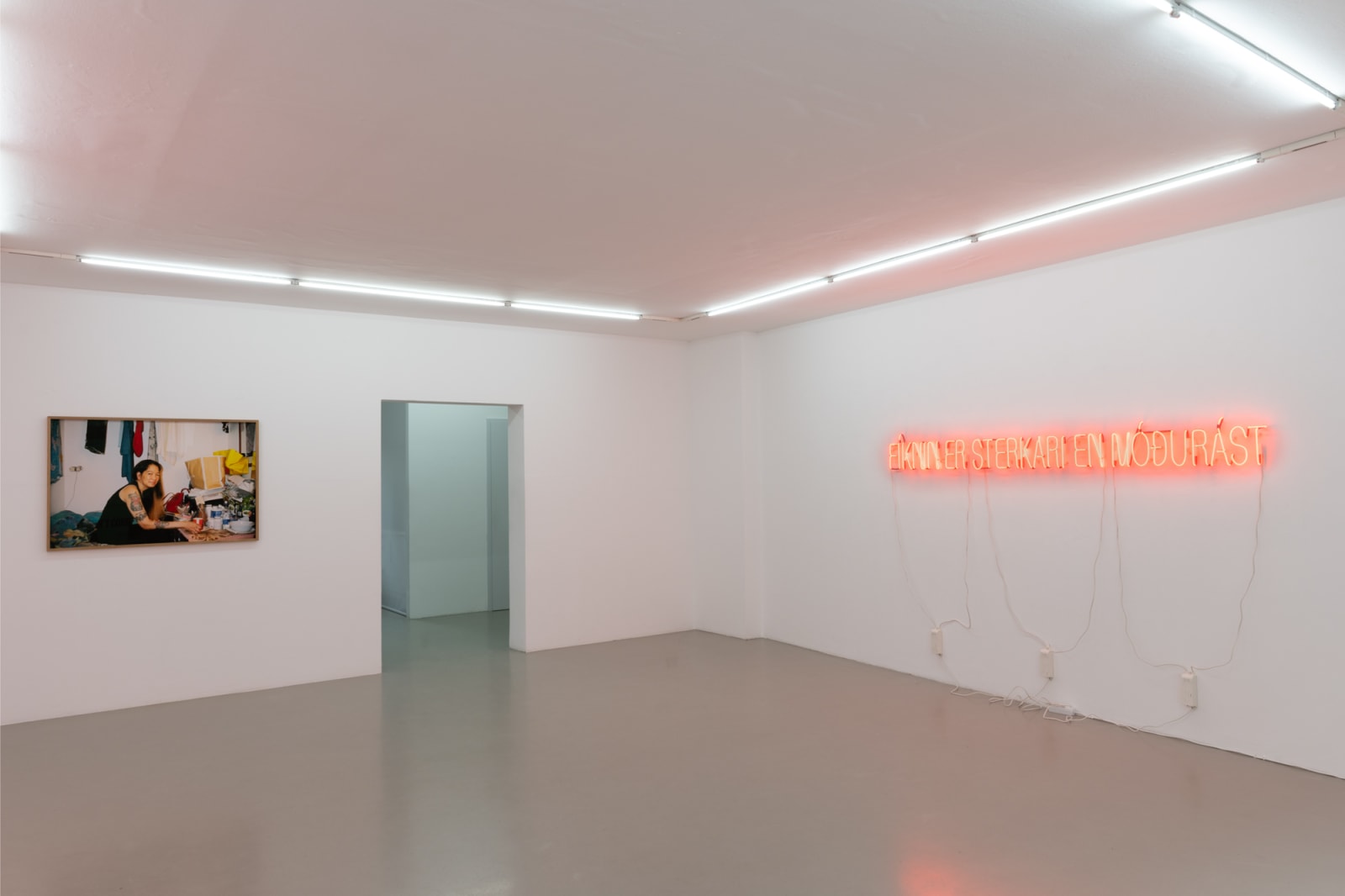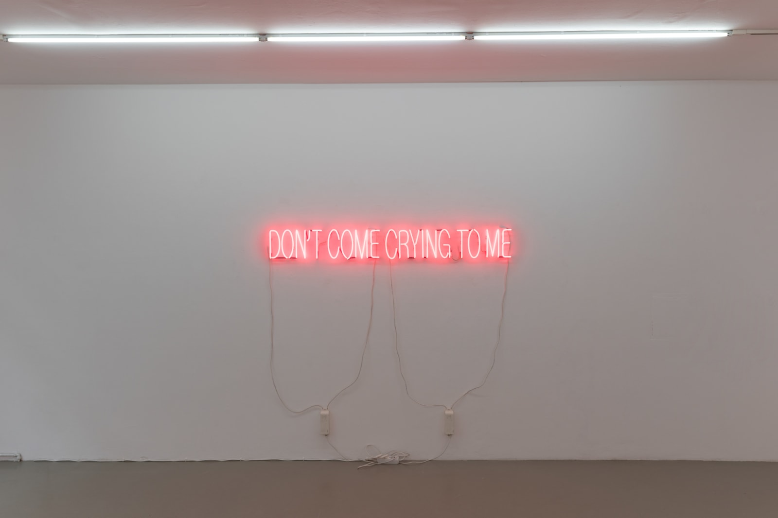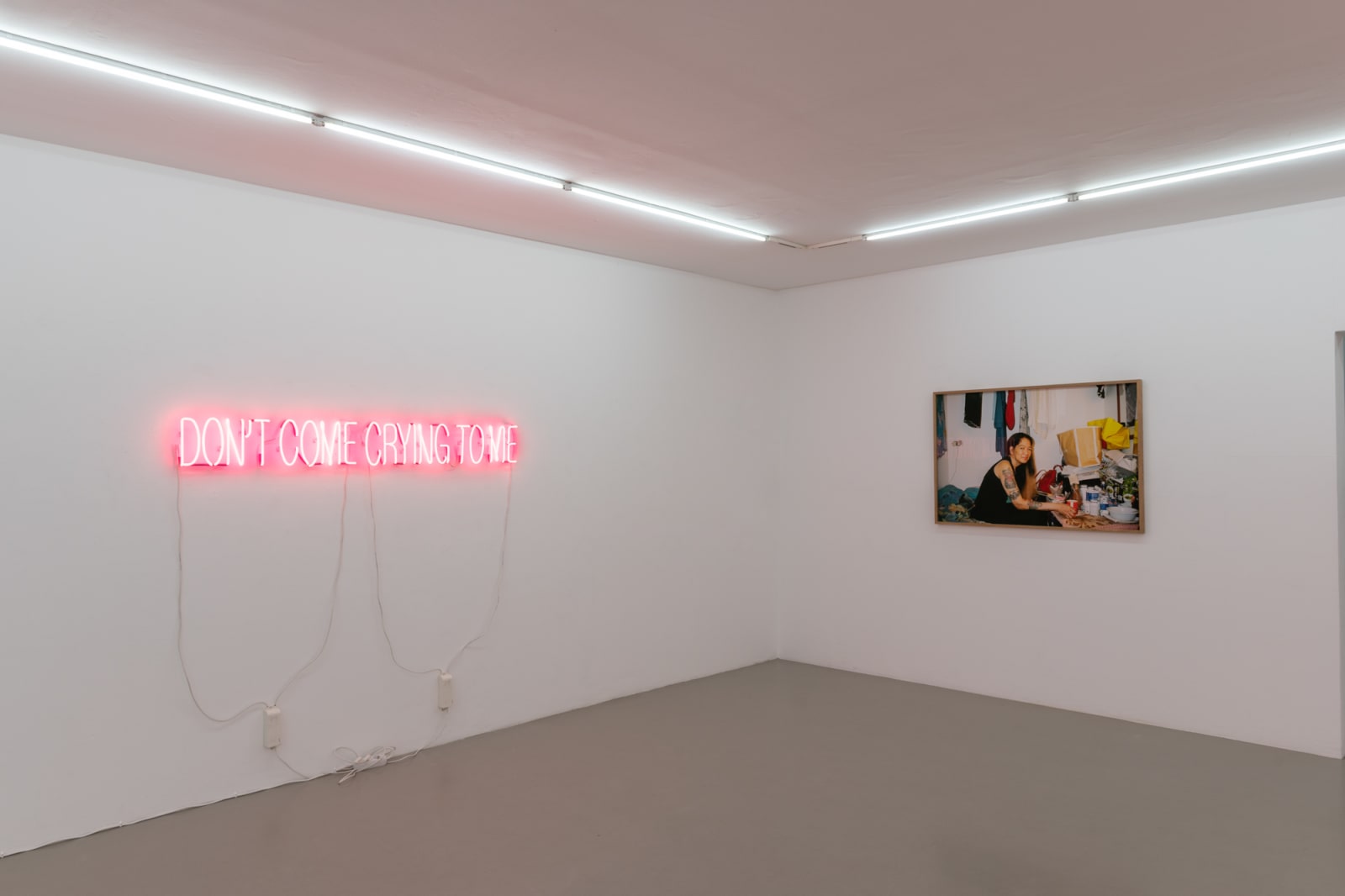 Melanie anchors the exhibition in a neon text piece spelling out the phrase “don’t come crying to me.” Drawing on autobiographical experience, she recalls how her mother uttered this phrase when they first discussed her then-new relationship with her partner. Across the gallery is another text, reading “addiction is greater than maternal love.” With characteristic irony, Melanie reflects on both the protective urge in maternal love and its limitations, which immigrant life often renders more complex: