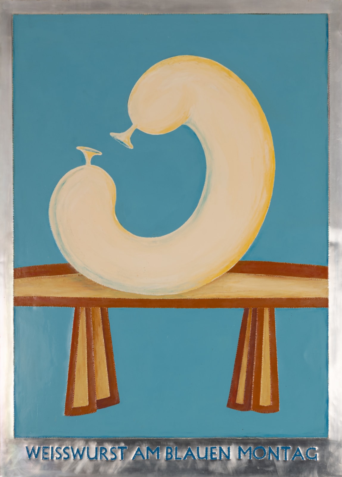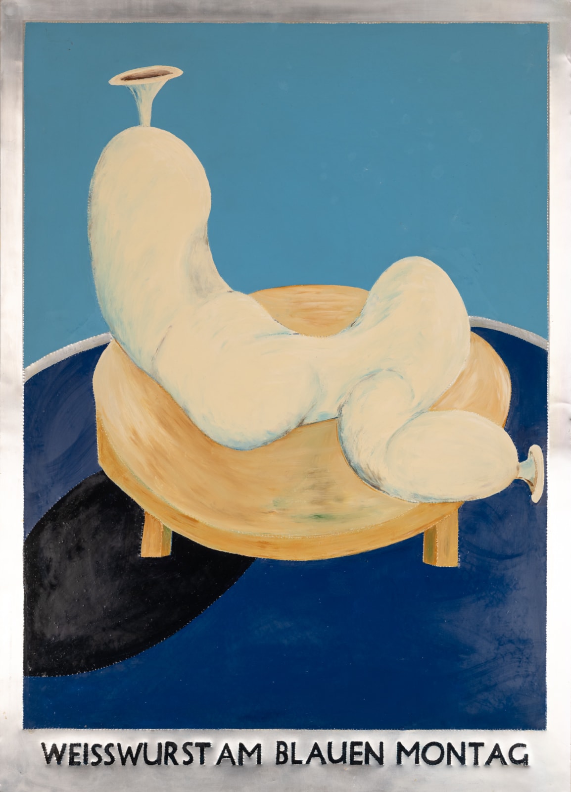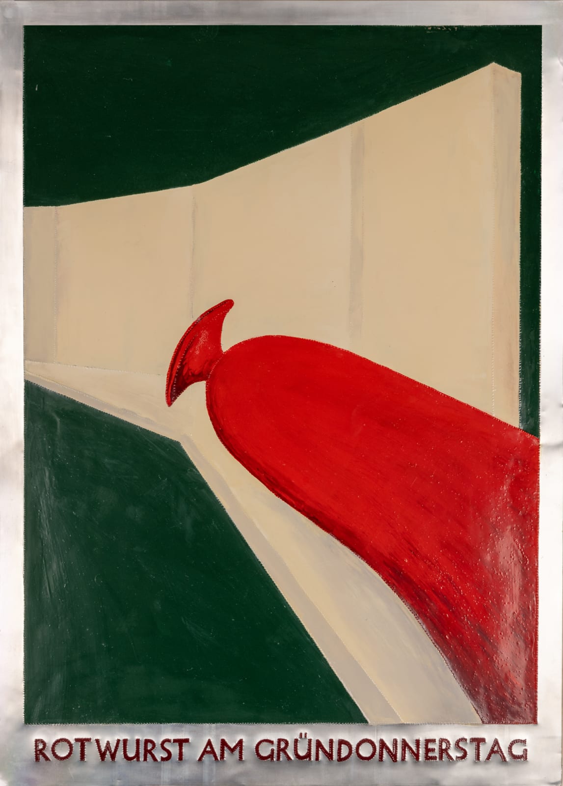The "Wurst series," created between 1999 to 2001, comprises glossy paintings (elasmos) of sausages on pedestals in the most intriguing positions. Each painting is accompanied by a title that sets the scene, such as "Blauwurst am Rosen Montag” or “Weisswurst am Blauen Montag." Inspired by the works of Francis Bacon and the recently deceased Günter Brus, these sausage depictions, resembling limbless humans, employ figurative distortion and abstraction. However, Malcolm Green diverges from the themes of social isolation and existential angst typically seen in Bacon's and Brus's works by infusing his pieces with humour. In Green's works, the sausages serve as metaphors for hidden truths and ongoing speculation, injecting a playful twist into the exploration of inner complexities.