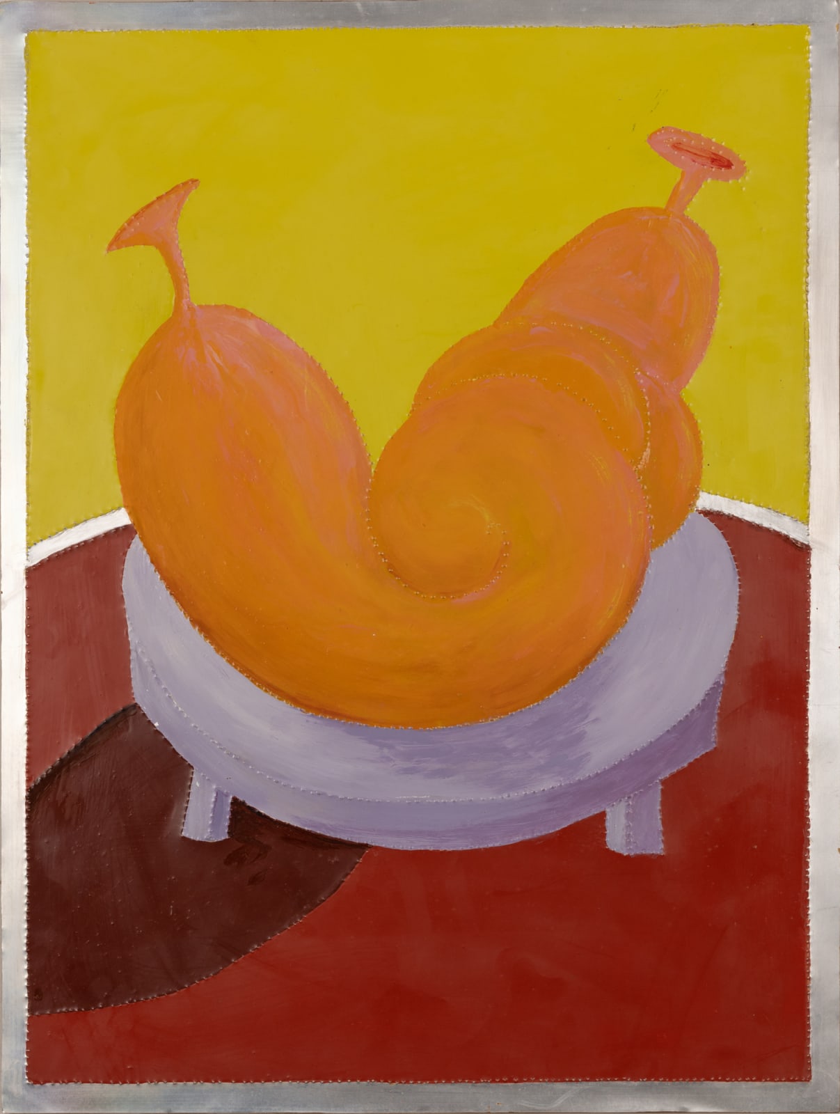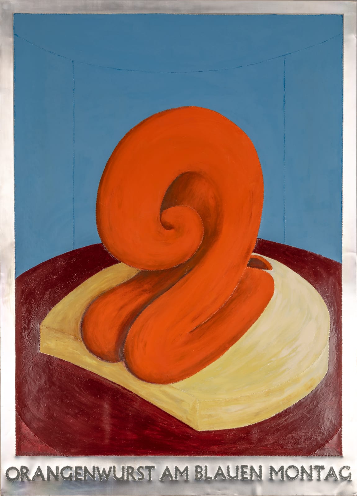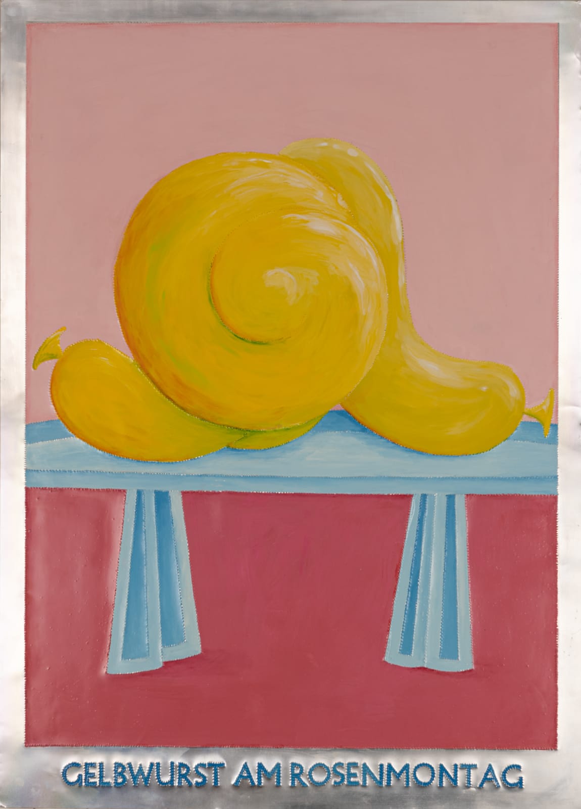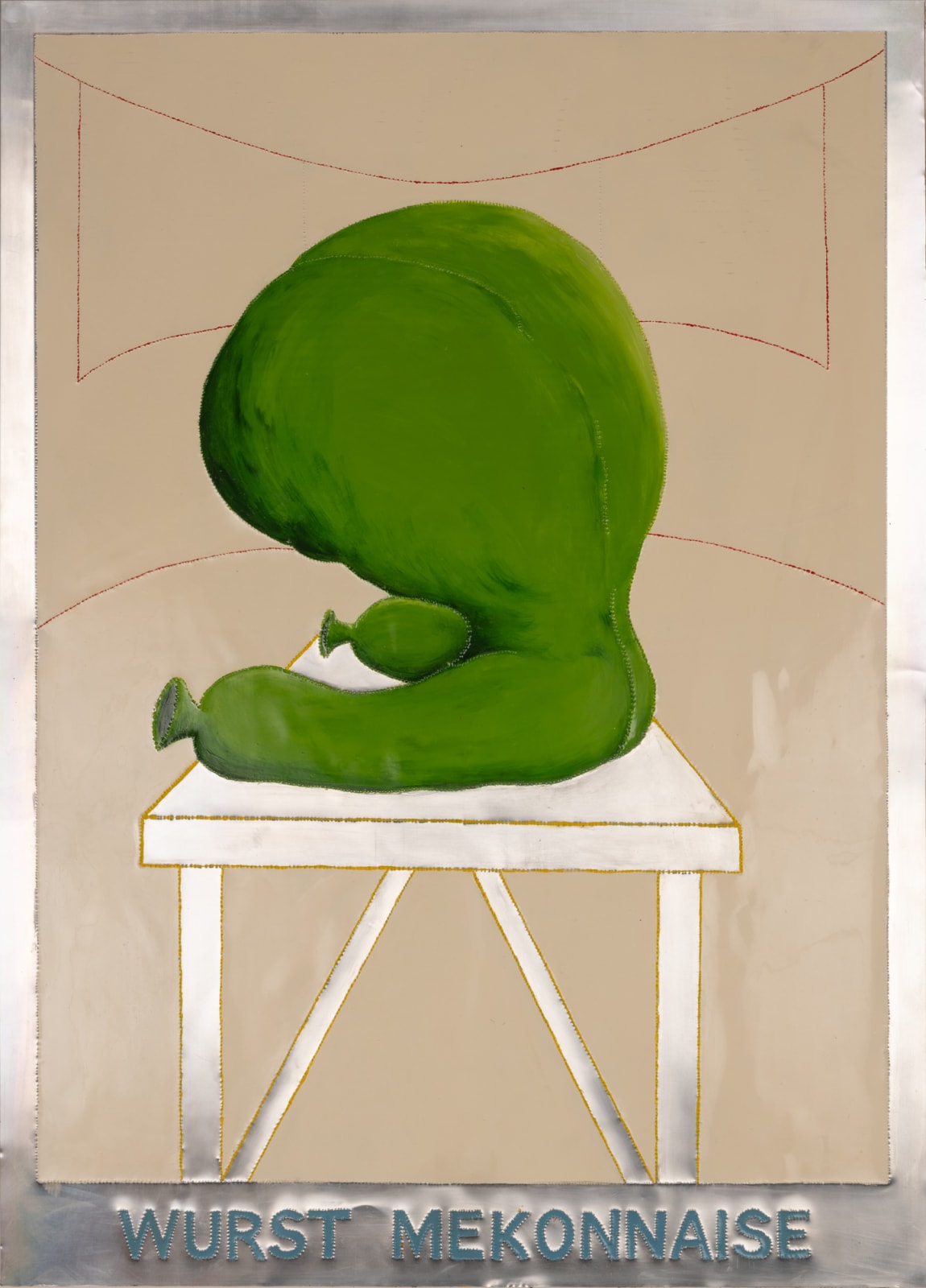 The "Wurst series," created between 1999 to 2001, comprises glossy paintings (elasmos) of sausages on pedestals in the most intriguing positions. Each painting is accompanied by a title that sets the scene, such as "Blauwurst am Rosen Montag” or “Weisswurst am Blauen Montag." Inspired by the works of Francis Bacon and the recently deceased Günter Brus, these sausage depictions, resembling limbless humans, employ figurative distortion and abstraction. However, Malcolm Green diverges from the themes of social isolation and existential angst typically seen in Bacon's and Brus's works by infusing his pieces with humour. In Green's works, the sausages serve as metaphors for hidden truths and ongoing speculation, injecting a playful twist into the exploration of inner complexities.