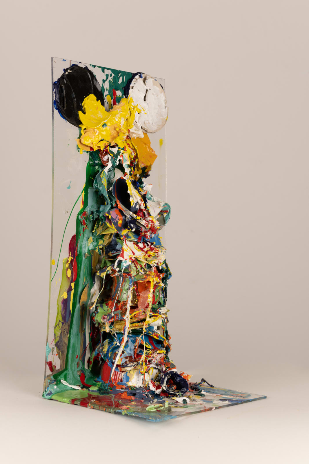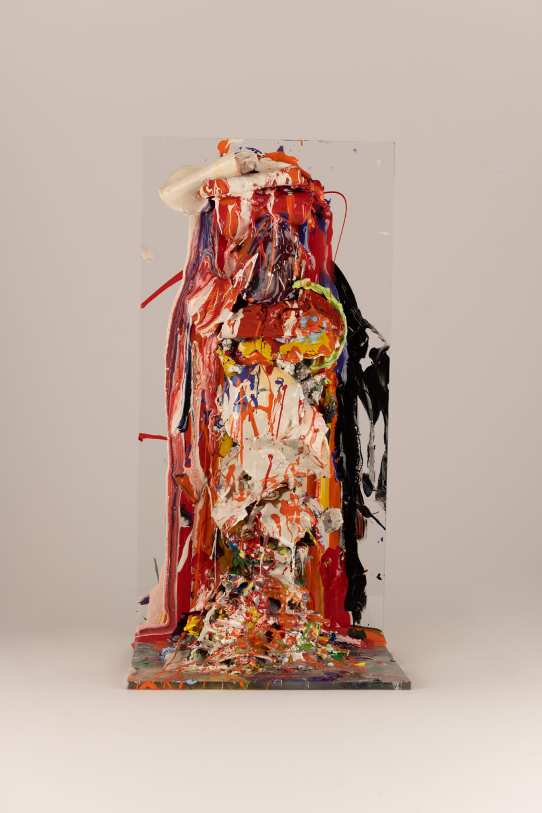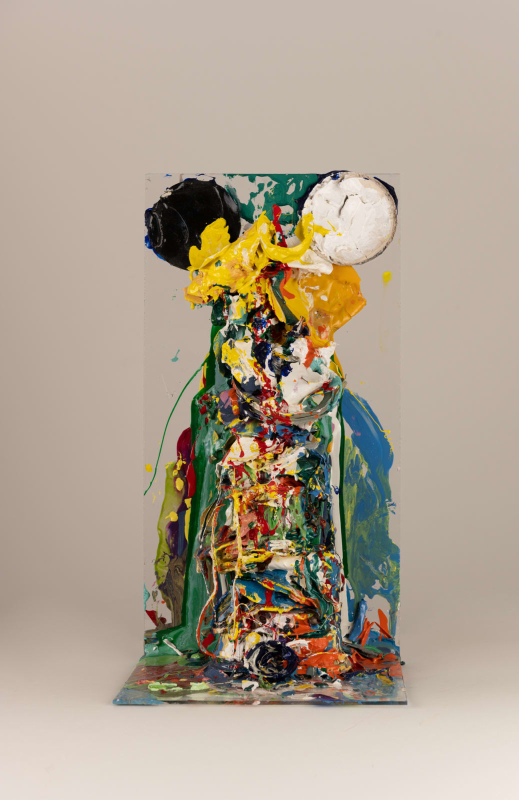 Another series showcased in the exhibition is titled "Towers 1 –16," spanning from 2001 to 2023. These towers are built from layers of hardened gloss paint, accumulating over the artist's daily studio routine. Evolving over time, they adopt varied forms and colour schemes, becoming integral to Green's body of work. Symbolising the passage of time, routine regularity, and the value of consistency, each tower represents the artist's patience, meticulously layered with different paint shades challenging viewers to question conventional norms, prompting them to reevaluate their perceptions and immerse themselves in a rich tapestry of ideas and interpretations.