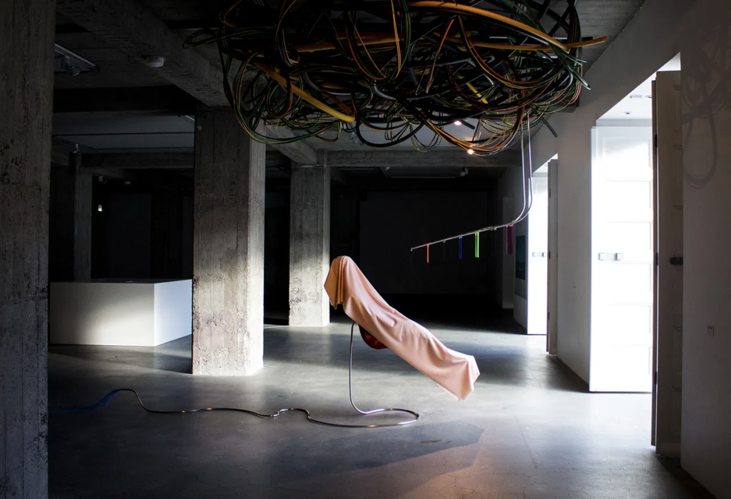 Mied media, latex, Cole, mud, blood, fruit, plastic fruit, electrical extension cord, mirror, sound work